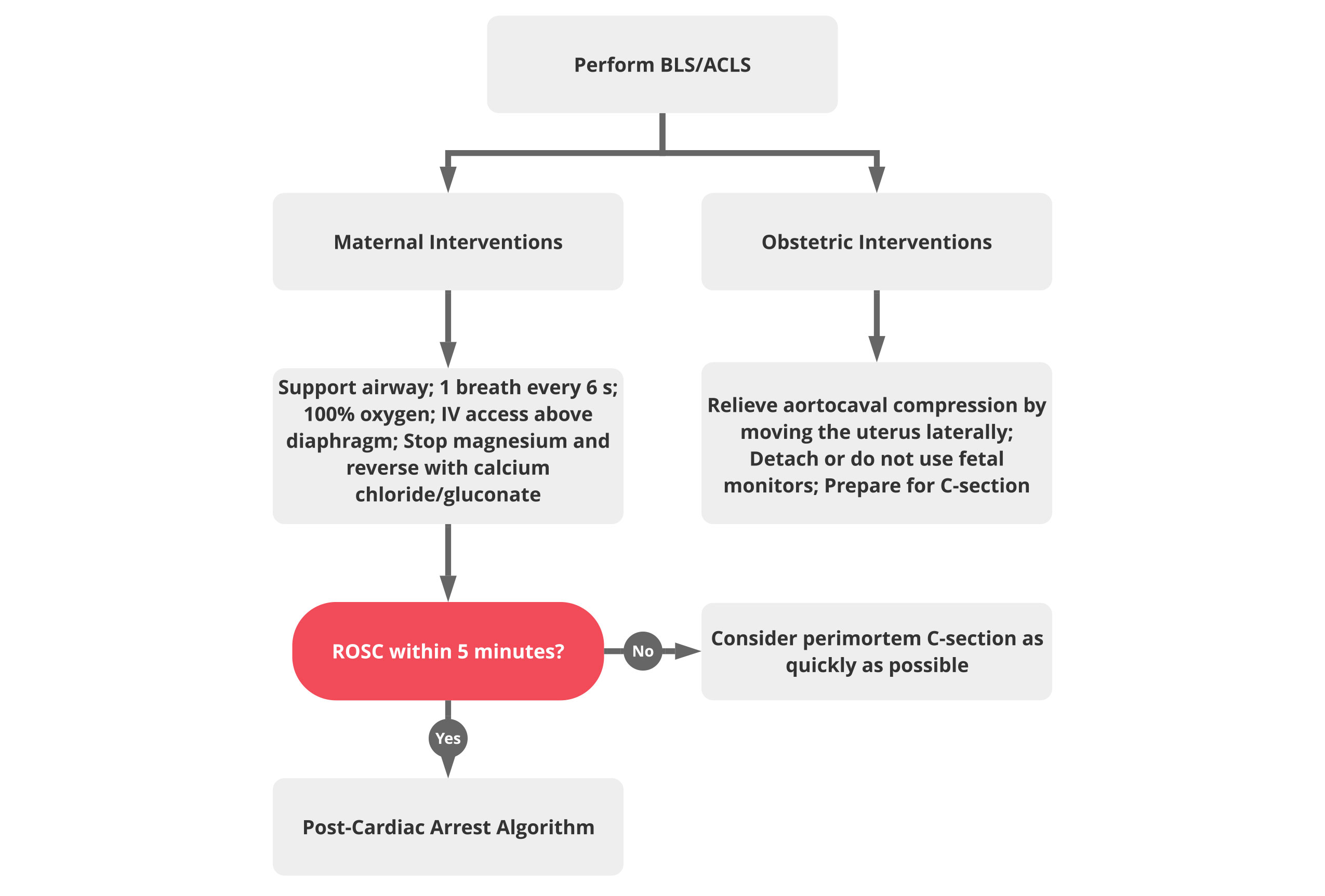 - If ROSC does not occur within 5 minutes, consider perimortem Cesarean delivery