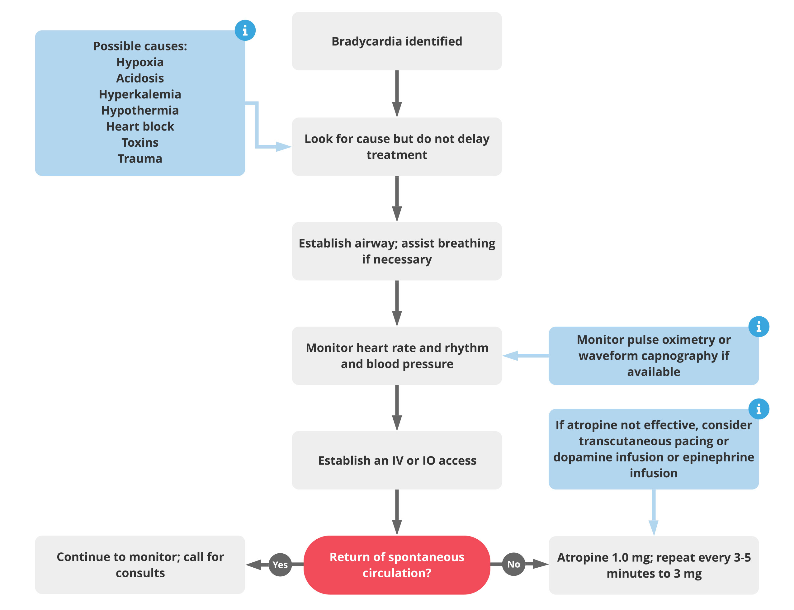 - Do not delay treatment but look for underlying causes of the bradycardia using the Hs and Ts.
