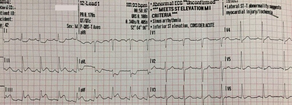 The patient is whisked away to the cardiac cath lab where a 95% occlusion to the RCA is successfully opened and stented. The patient is discharged a few days later.