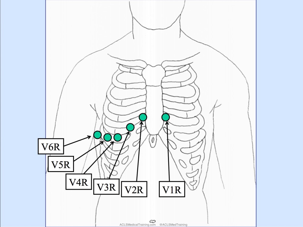 ST-segment elevation is noted in leads V2R, V3R, V4R, V5R, and V6R suggesting proximal occlusion of the RCA and right ventricular infarction.