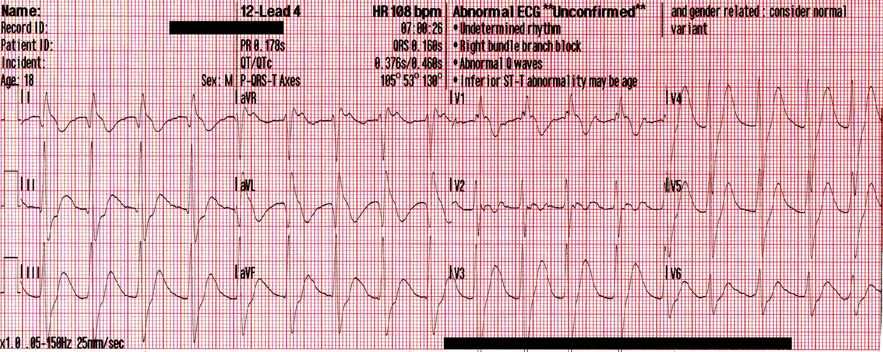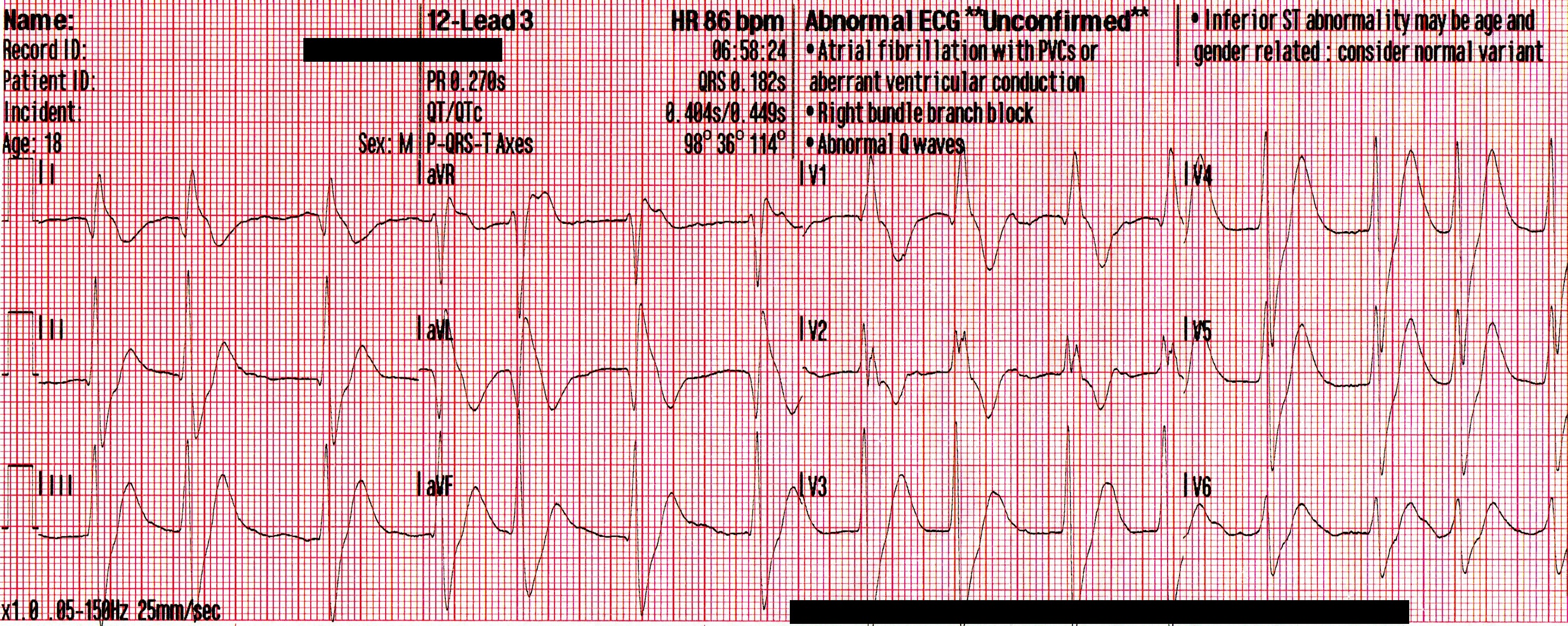 This patient’s presentation can likely be explained by the complex interaction between each of the substances that were ingested. Cocaine mixed with alcohol forms cocaethylene when metabolized by the liver; a substance that’s significantly more cardiotoxic, and possesses a half-life 3-5 times that of cocaine alone. Amongst it’s multiple mechanisms, it acts as a Class Ic sodium-channel blocker, which is represented on the ECG as a progressive widening of the QRS complexes, and the development of an extreme rightward axis in the frontal plane. These channel-toxic effects are amplified by increases in heart rate and decreases in pH – two elements that are found in spades for this young man.
