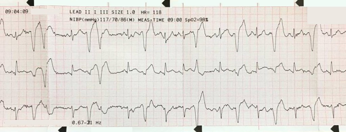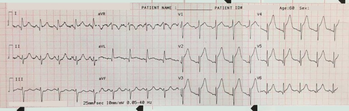 The 12-lead ECG was deemed to show acute anterior STEMI consistent with LAD occlusion. Pre-alert was made to the primary percutaneous coronary intervention (PPCI) center.