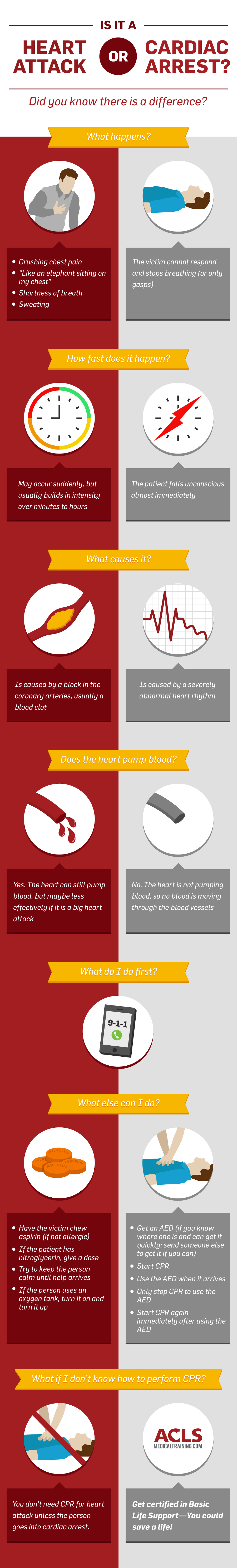 Did you know that there is a big difference between heart attack and cardiac arrest? The major difference is that HEART ATTACK is a blood flow problem and CARDIAC ARREST is an electrical problem.. Both conditions can be deadly, but they are caused by (and treated with) different things.